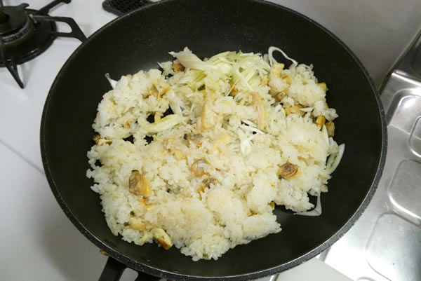 | 3. | フライパンにごま油をひき、ご飯を炒め、ある程度馴染んだら、アサリのむき身と薄揚げを足して混ぜ合わせる。 |