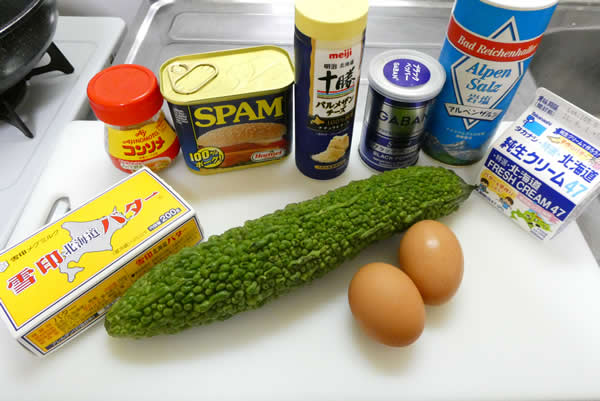 | 3. | フライパンを熱してバターをひき、まずゴーヤを炒める。適度に塩・胡椒・顆粒コンソメを振りかけ、次にSPAMを加えて混ぜ合わせる。 |