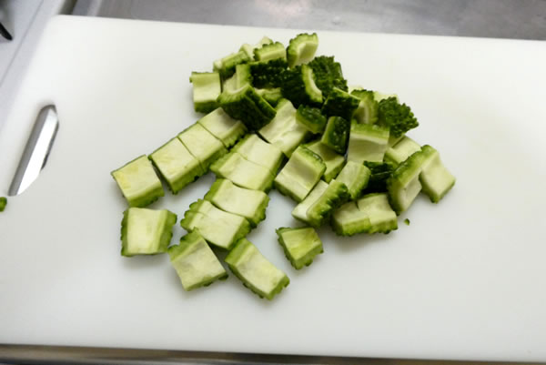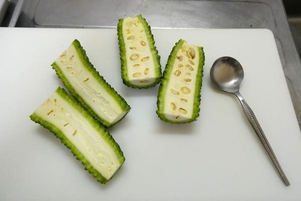 | 1. | ゴーヤは1本を縦半分に切り、スプーンで種をかき出して水洗いして、適当な大きさに角切りする。そして、ある程度の柔らかさになるまで塩茹でする。 |