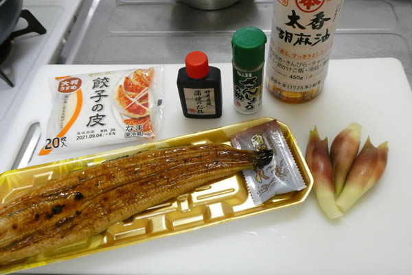 餃子の皮で鰻とみょうがで作ったタネを包んで、できたのが9個ばかり。ちょっと少なかったです。