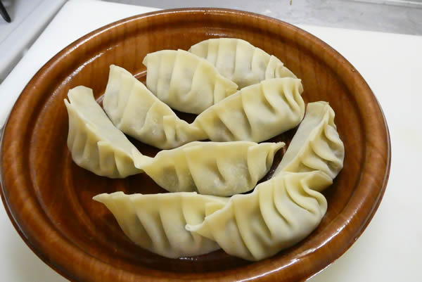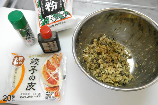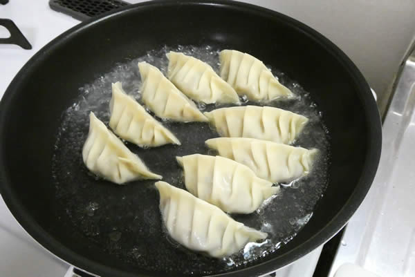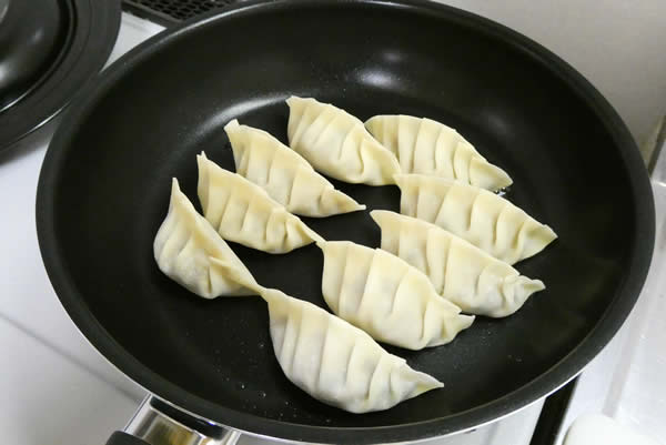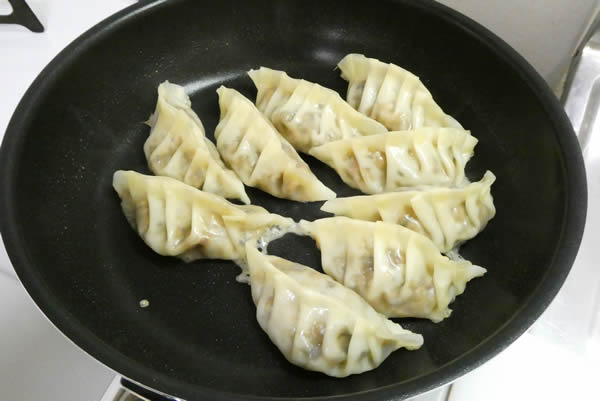| 2. | 作ったタネを餃子の皮で包み、フライパンにごま油をひいて背の面を焼き、少し焦げ色がついたら水を適量入れて蓋をして強火にする。 |