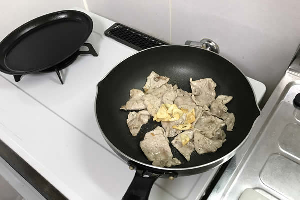 | 5. | そのフライパンで豚肉を炒め、ある程度火が通たら先程のニンニクを入れて混ぜる。 |
