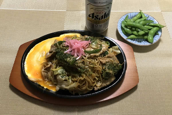 出来上がりはこんな感じです。やっぱり焼きそばにはビール、それに定番の枝豆。枝豆はスーパーで売ってたのをそまま盛り付け、はい、手抜きです。
