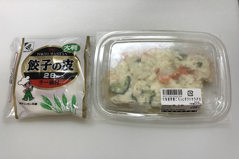 大きめの餃子の皮とスーパーで買ってきたポテトサラダ。材料はこれだけ。