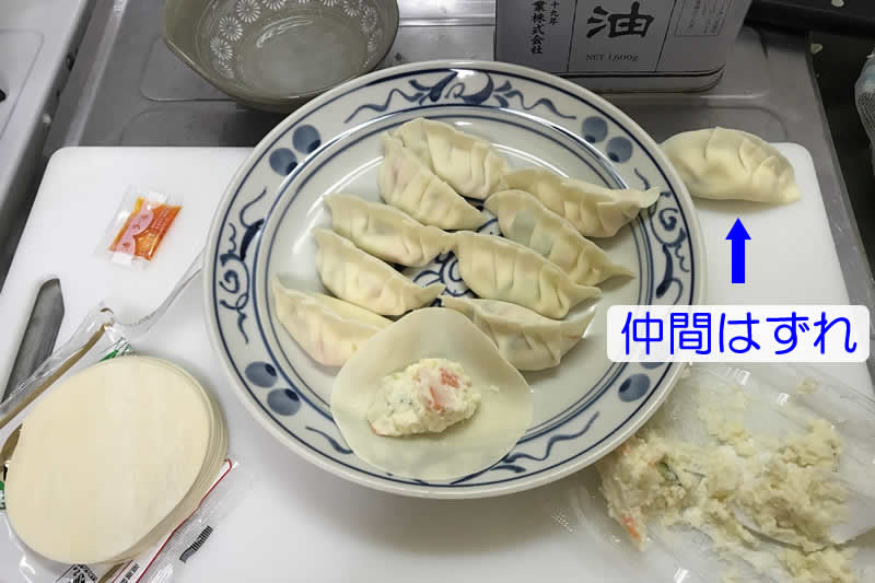 ポテトサラダを餃子の皮に包み、ヒダヒダ作って10個完成。あと1個ですが、なぜか1個は仲間はずれ。