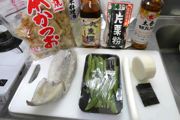 | 1. | 鍋に水と昆布を入れ、沸騰したらかつお節でダシをとる。 |