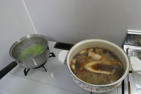 グリーンピースを茹でている間に、煮込んでいる丸ごとイカを半身に分けます。そのほうが火の通りもよくなり、味も染み込みやすくなると思いましたが、半身のイカの片方が丸まってしまい、困った困った。まあ、尾のある方だけご飯の上に乗せるので、良しとします。