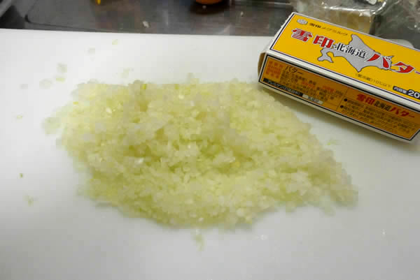 まず玉ねぎをみじん切りにします。ハンバーグを作る要領です。準備写真にバターを入れ忘れたので、ここで映しておきます。