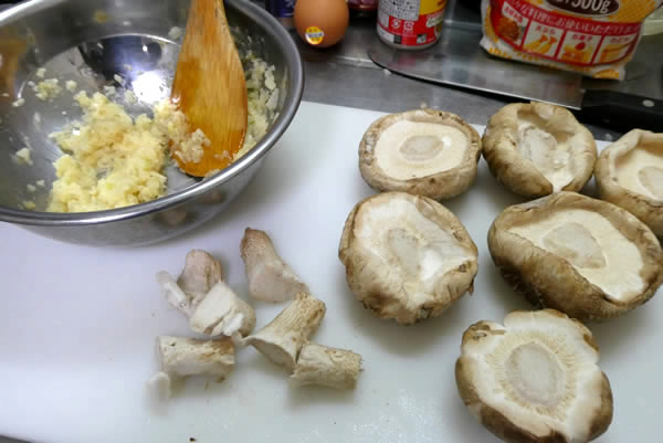 | 4. | しいたけの柱を切り除き、裏の部分に小麦粉を塗り、挽き肉の材料を詰める。 |