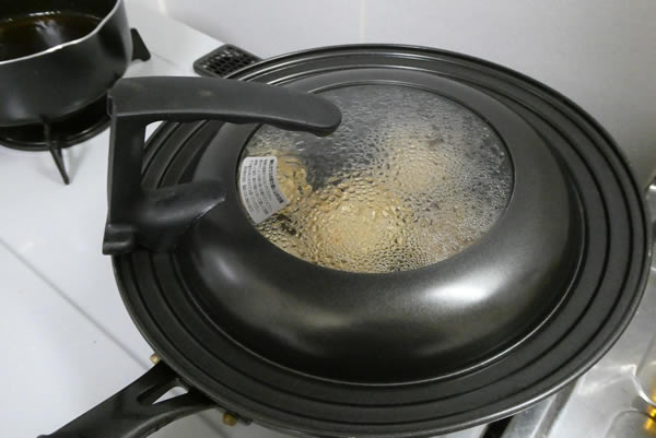 フライパンに鍋蓋をして、蒸し焼きにします。肉に火が通るようにじっくり中火でガマンガマン。
