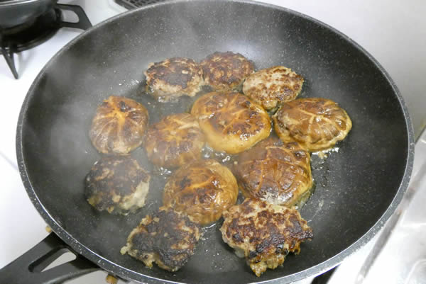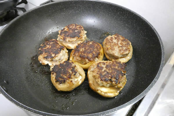 | 6. | フライパンにバターをひき、肉詰めしたシイタケを肉の部分を下にして、並べるように置く。そして鍋蓋をして蒸し焼きにする。 |