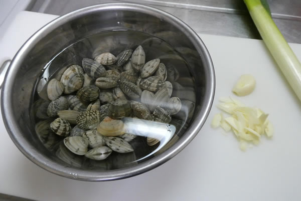 | 1. | あさりは、しばらくの間塩水につけておく。にんにくはスライスする。 |
