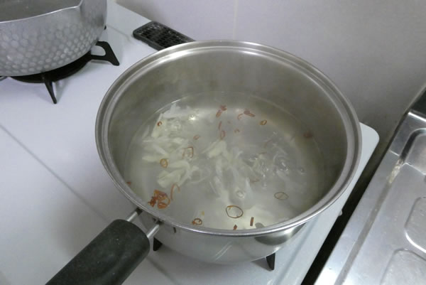 中くらいの鍋に湯を沸かし、スライスにんにくを煮立たせます。次に料理酒とみりんを加え沸騰させ、最後に輪切り唐辛子を散らします。そして塩を振り、ちょっと味見。どうも唐辛子を入れ過ぎたようで、半分くらい取り除きました。ピリピリ加減も程々がいいでしょう。