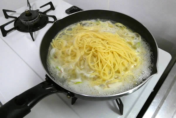 フライパンのあさりスープを沸騰させ、そこに硬めに茹で上げたスパゲティーを入れ、スープを麺にからめるように混ぜ合わせます。