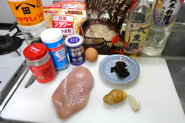 チキン味噌かつの材料はこれ。しょう油が写っていますが、使いませんでした。小皿の黒い固まりは、八丁味噌です。これが大切。