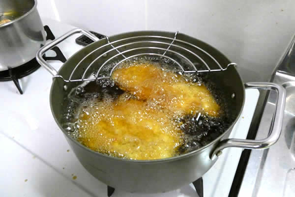 いよいよ油で揚げます。揚げ油が古くて、新しく入れ替えたら、油が少なすぎて困りました。でも何とかイケそう。いつもよりこまめに表裏を返します、焦げ付かないように。