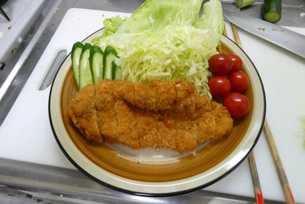| 6. | 油で鶏肉を揚げ、野菜を添えた器に盛りつけ、上から味噌ダレをかけて。チキンかつの出来上がり。 |
