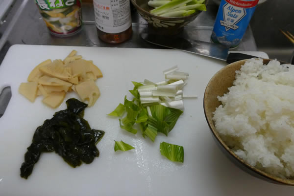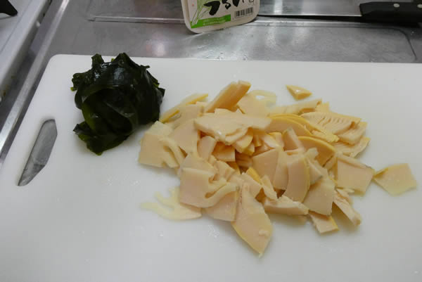 若竹煮から竹の子とわかめを炒めご飯用に取り出し、わかめは適当な大きさに切っておきます。「うるい」も食べやすい大きさに切ります。炊き立てご飯も山盛り準備OK。