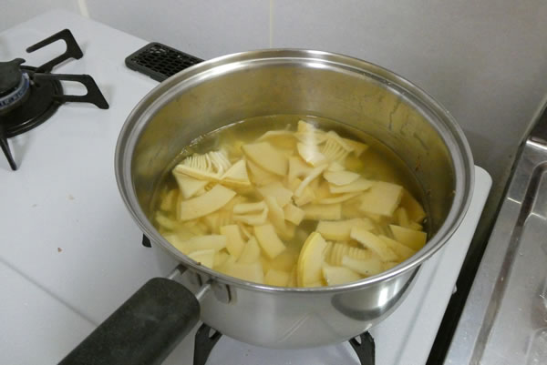 切った竹の子をいったん湯通しします。白い粉がはがれました。栄養成分が飛んで勿体ないかもしれないけど、見た目も大事。