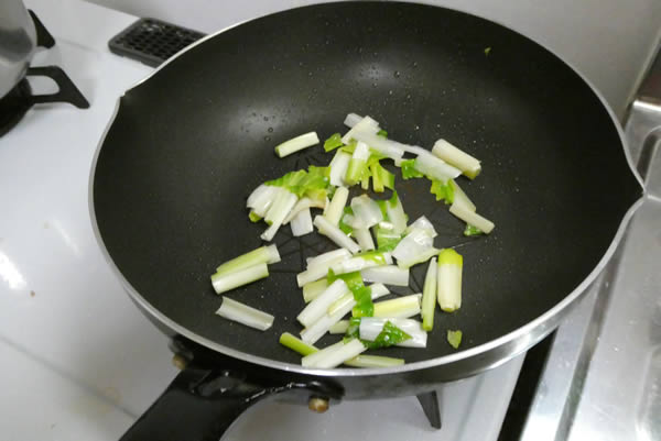 | 3. | フライパンにごま油をひき、適当な長さに切ったうるいを炒める。 |