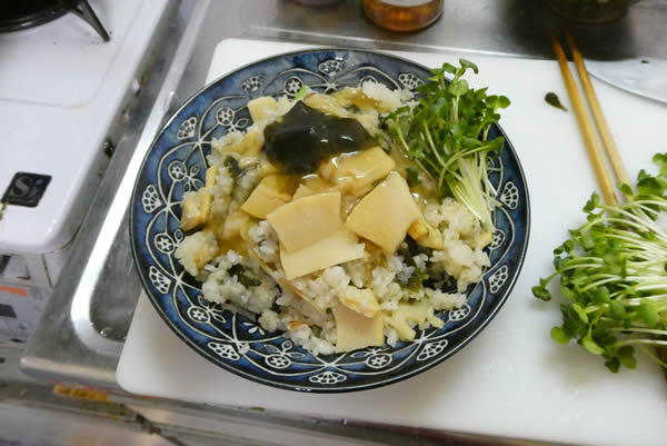 | 4. | 次にご飯を加え、炒めて、塩、胡椒で薄めに味付けをして、若竹煮の竹の子とわかめを加え、煮汁を少し入れる。 |