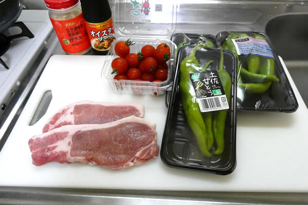 材料はこんな感じ。スーパーで大きいししとうを見つけたので、豚肉と炒めると美味しいかなと思って、この料理を作ることにしました。豚肉は、あえてトンカツ肉を棒切りにして炒めます。 ししとうは、「土佐の甘とう」です。初めて知りました。「万願寺とうがらし」というのもありました。