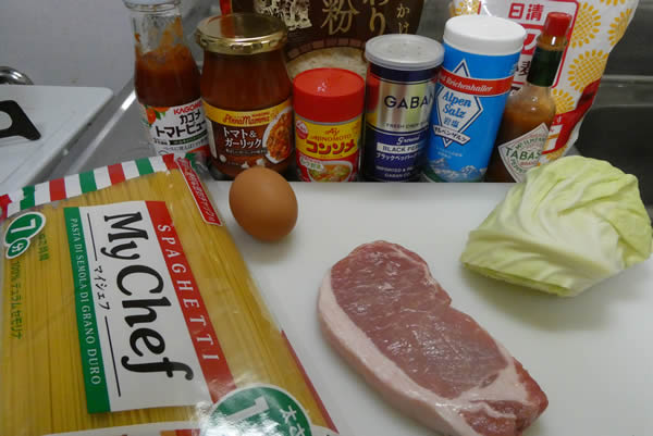 材料はこんな感じ。今回の目的は、名古屋名物あんかけスパゲティを再現することにあります。何回か通ったので味はしっかりと覚えております。トマトベースのとろとろスープ、ピリリと辛く、ちょっと刺激的。トマトソースは、カゴメのアンナマンナ(トマト&ガーリック)の力を借りることにします。