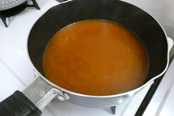 | 2. | 手鍋に湯を沸かし、顆粒コンソメを適量溶かす。次に、かごめのアンナマンナ(トマト&ガーリック)を目安分加え、トマトピューレも加え、煮立たせる。そしてタバスコを少々振り入れる。 |