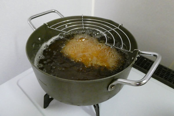 ソースを作っている途中で揚げ始めたトンカツ。いい色になりつつあります。
