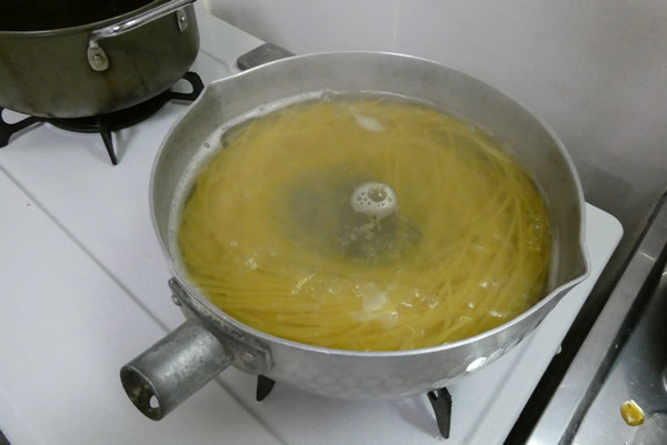 トンカツが揚がるまでに、スパゲティを茹で始めます。そしてトンカツを油から上げて、スパゲティも、もうすぐ茹で上がりそう。