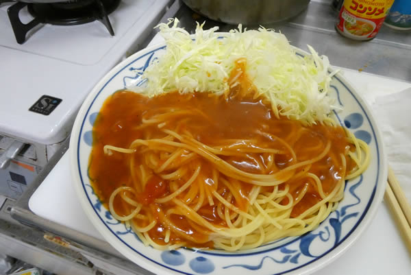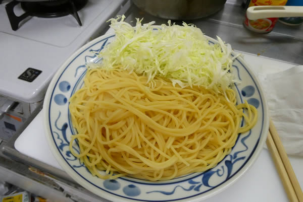 | 6. | 茹で上がったスパゲティをお皿に盛り、千切りキャベツを添える。 |