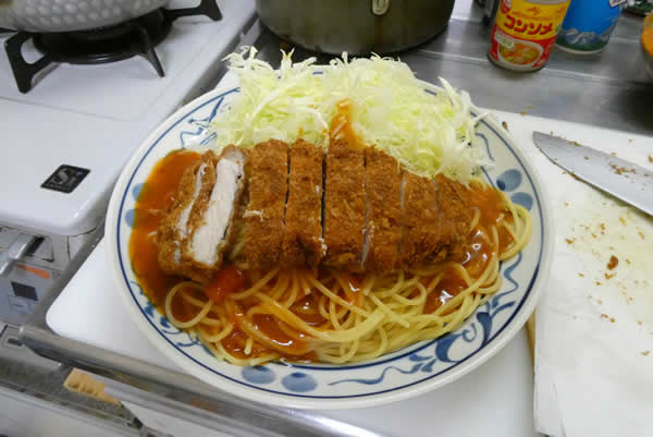 | 7. | スパゲティの上にあんかけソースをかけて、上に適当な大きさに切ったトンカツを乗せて出来上がり。 |