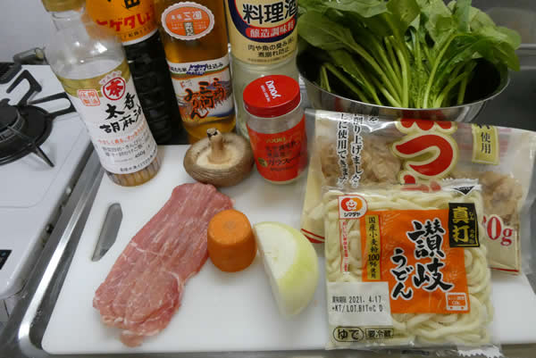 材料はこんな感じ。今回はやけに賑やかしいですが、調理手順は大したことありません。味のベースは、しょう油かソースか迷いましたが、しょう油ベースでいくことにしました。ダシは焼きうどんということもあり、鶏ガラスープにします。かつお節は上から振りかけるために用意。