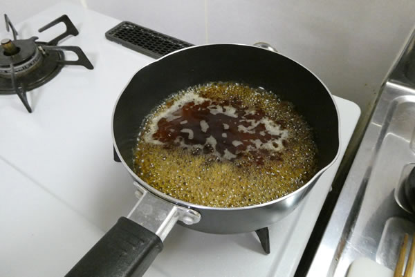 | 4. | 小鍋に湯を沸かし、顆粒の鶏ガラスープを溶かし、お酒・みりん・濃口しょう油を加え、焼きうどん用のタレを準備する。 | |