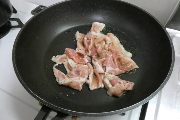 | 3. | 豚肉は塩・胡椒を振りかけ、これも適当な大きさに切っておく。 | |