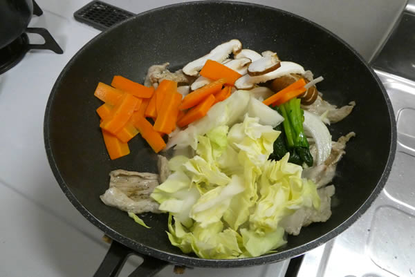 豚肉に火が通ったら、野菜を加えます。まとめてドドンと。ちょっとほうれん草が足りなかったかも。もたもたしてると火が通り過ぎるので、このまま進めます。