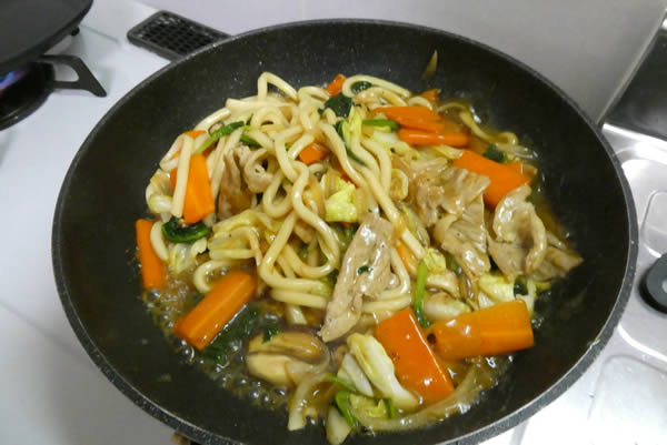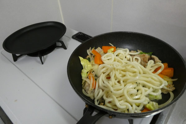 | 7. | 次にうどんを入れて、フライパンを振りながら混ぜ合わせる。 | |