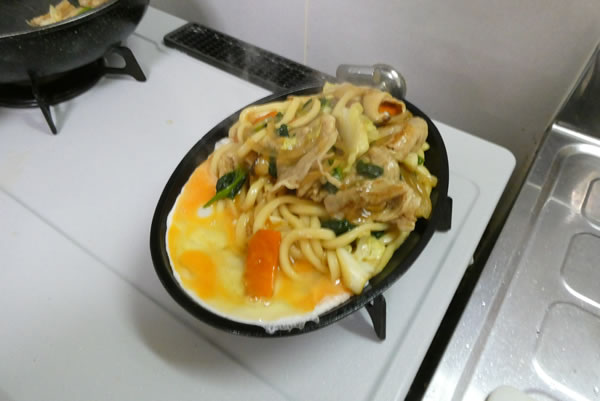 熱してあった鉄板に焼きうどんを盛り付け、鉄板の隅を少し空けて、そこに溶き卵を流し入れて出来上がり。最後にかつお節と紅生姜を上からパラパラと。