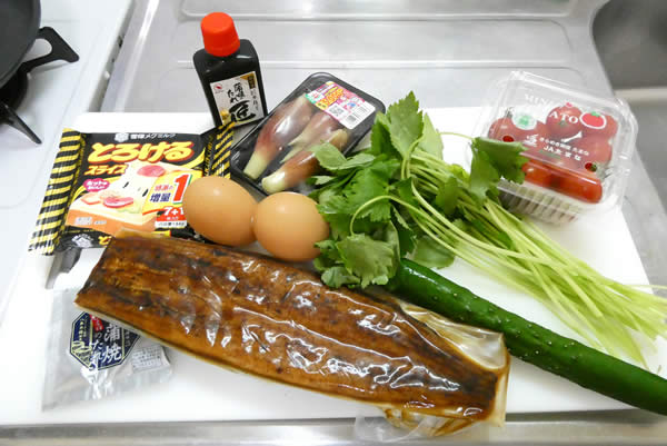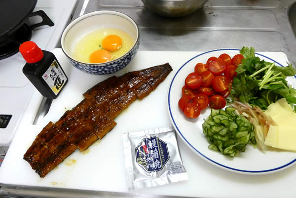 材料はこんな感じ。うなぎはスーパー等で売っている真空パック。うなぎのタレは多めに使うので、別売りを用意しました。