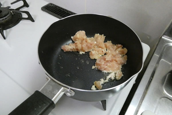 | 3. | 小鍋にごま油をひき、鶏ひき肉をほぐしなが炒める。ある程度ひき肉に火が通ったら、水を少し加えて顆粒鶏ガラスープを溶かす。 |