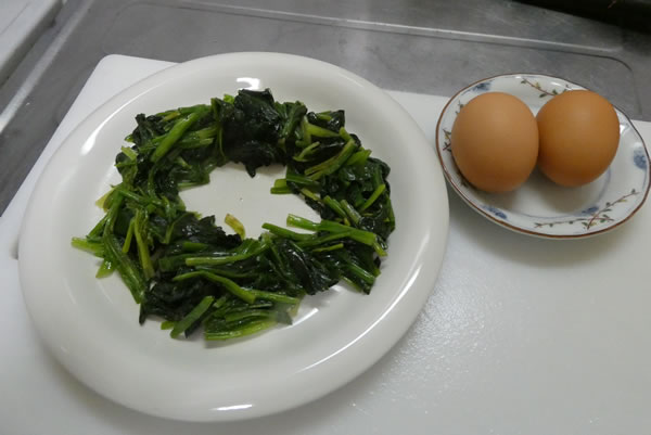 | 7. | お皿に炒めたほうれん草を乗せておく。 |