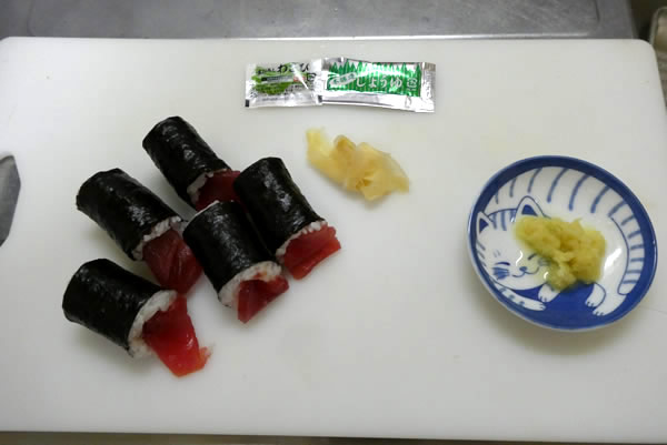 | 1. | マグロの巻き寿司をパックから取り出して、マグロと海苔巻きを手でより分ける。おろし生姜を準備しておく。 |