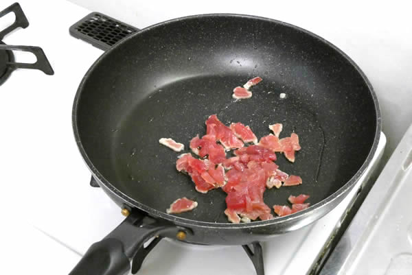 | 3. | 熱したフライパンにごま油をひき、まず最初にマグロを炒める。この時におろし生姜少々を足して炒めるのもよい。 |