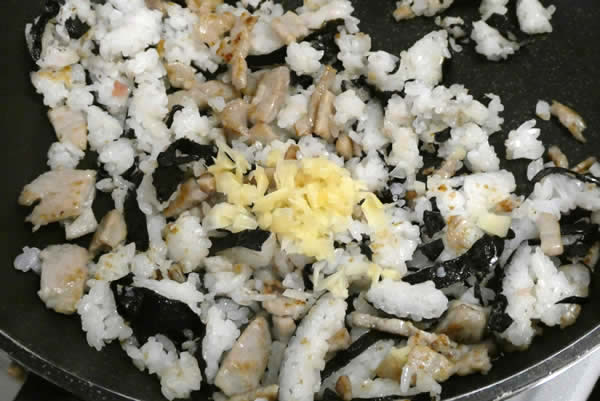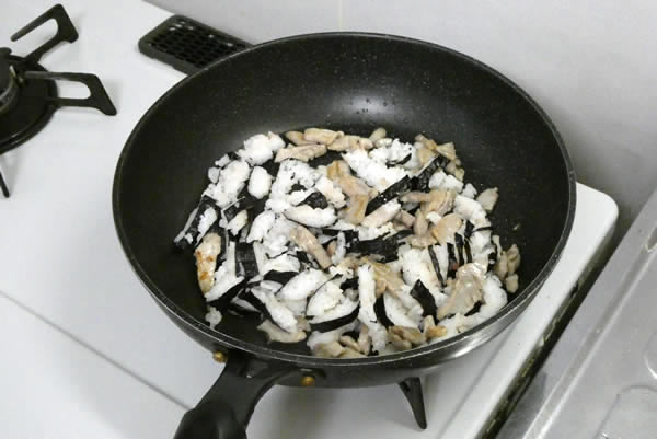 | 4. | マグロにある程度火が通ったら、切り分けてあった海苔巻きを加えて炒める。米に味が付いているので、塩・胡椒はしない。 |