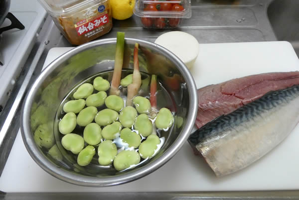 材料はこんな感じ。鯖のムニエルだけでは淋しいので、付け合わせに、谷中生姜・そら豆・ミニトマトと、賑やかにいきます。谷中生姜の味噌は、どんな味噌がいいのかわからないので、取り敢えず普通の味噌汁の味噌、ということで。