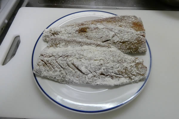 次に両面に小麦粉をまぶします。まぶすというより、とんかつ衣の要領で小麦粉を付けるとういう感じ。ちょっとはたいて、余分な小麦粉を取り去ります。これで準備完了。