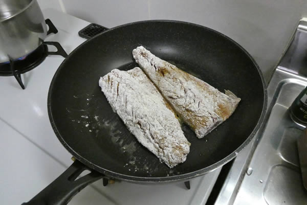 | 3. | 生鯖に小麦粉を付けて、余分な小麦粉を払い落とす。 |