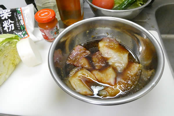 | 1. | あんこうの切り身はよく水洗いして、おろし生姜・濃口しょう油・お酒・みりんのタレに30分ほど漬けておく。 |