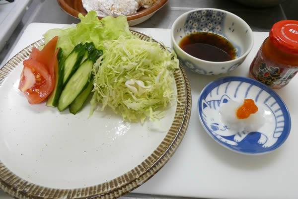 | 2. | キャベツを千切りして、きうり・トマトとともに、付け合わせの準備をする。 |