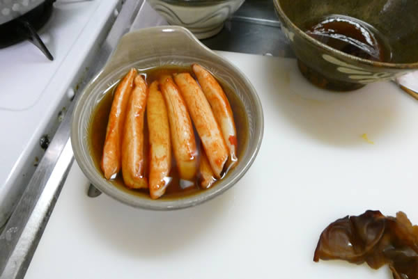 顆粒鶏ガラスープをお湯で溶かし、お酒・薄口しょう油を加えて、焼きビーフン用のタレを作ります。そして、そのタレにカニかまを漬けておきます。